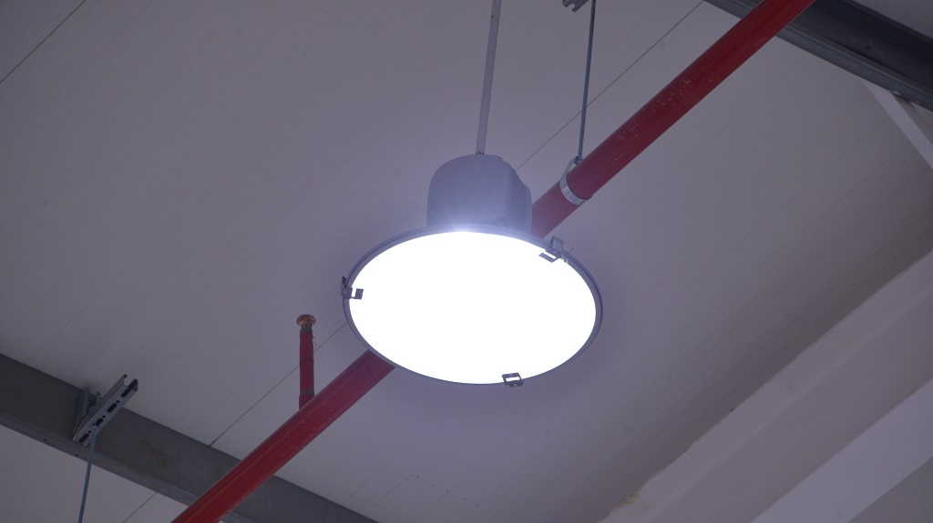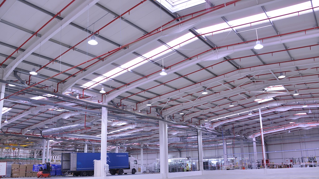In most recent years massive investments have been made in the Southern Mediterranean area. One of the most impressive examples of such investments is the completely new Tanger Med and Tanger Med 2 commercial ports and industrial areas. Located 40 km east of Tangeri on the Moroccan coast the complex covers a total area of 300 hectares and in fully operational it is able to manage a staggering 8.2 million containers, 700,000 trucks and 10 million MT of products making the infrastructure Africa’s largest by far. Of course, with such an important and strategic infrastructure being built, many global multinational brands have flocked to build new industrial facilities. Among these one of Fael LUCE’s Customer corporations, a world leader in third party design and construction of automotive parts furbishing transmissions, braking systems and on-board vehicle lights, has invested in the creation of a new plant in TangerMed. Fael was involved as the main partner for the high-bay lighting of the impressively large plant having to tackle significant design issues regarding the high temperatures typical of the region and the sheer size of the installation. Fael’s project development found satisfactory compliance by the Customer’s corporate tecnical branch. Fael LUCE supplied 476 luminaires of it’s world famous GALAXY SHOW 560 HIGH-BAY series. The photograph shows a small portion of the entire plant lit by Fael in it’s final contruction phases and before the installation of the proper production lines.